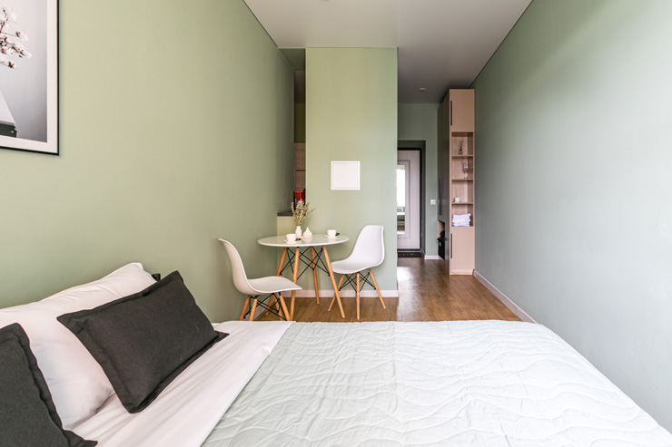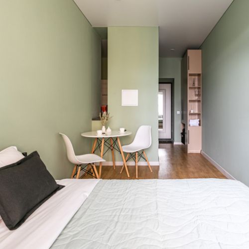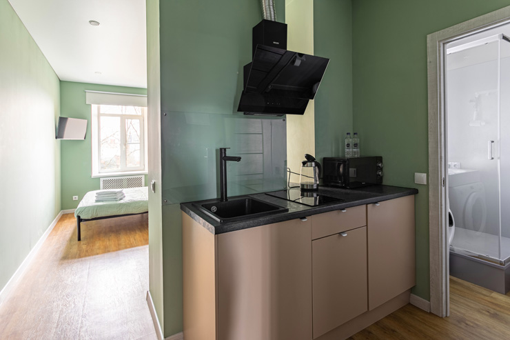 Жилой дом, в котором разместились апартаменты, возвышается на улице Шкапина. В распоряжении гостей двухместный стильный номер. В апартаментах есть спальная зона, отдельная ванная комната и кухонный уголок с электроплитой и микроволновкой печью. Среди прочих удобств – безлимитный интернет, стиральная машина и утюг с гладильными принадлежностями.