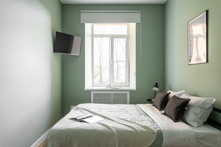 - Оборудование: микроволновая печь, мини-холодильник, набор посуды, плита электрическая, сейф, стиральная машина, телевизор, утюг, электрочайник